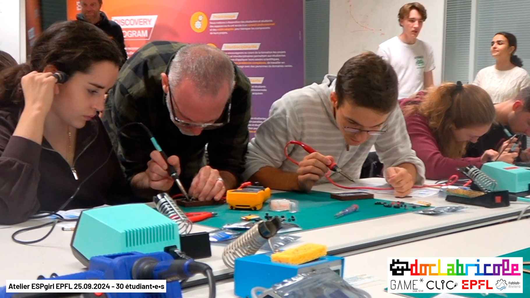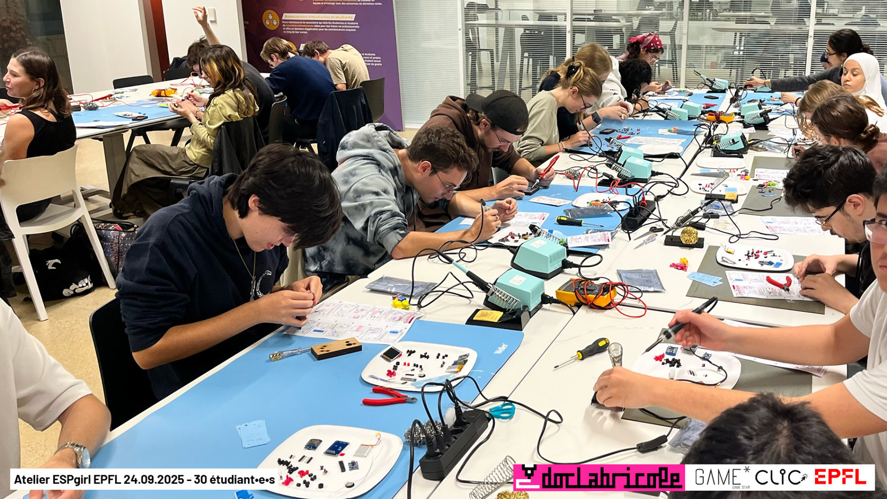 Atelier avec les étudiant•e•s de l’EPFL et de l’UNIL Ce sont 30 étudiant•e•s de l’EPFL et de l’UNIL qui sont venu•e•s le 24.09.2025, pour souder de toute pièce des mini consoles de jeux ESPgirl créées par Doc’Labricole (Guillaume Reymond), pour cet atelier organisé par l’association estudiantine pour la promotion du jeu vidéo Game* (Clic) Retrouvez toutes les infos sur cette mini […]
